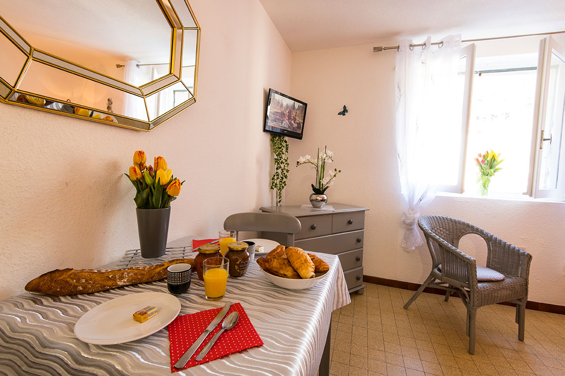 Gîte 2 Studio refait à neuf tout confort – au 1er étage – SDE – TV – climatisation – buanderie avec lave-linge et sèche-linge communs – animaux acceptés sous réserves. Parking privé. Wifi. A 200 m des Thermes. Tarif spécial curistes.
