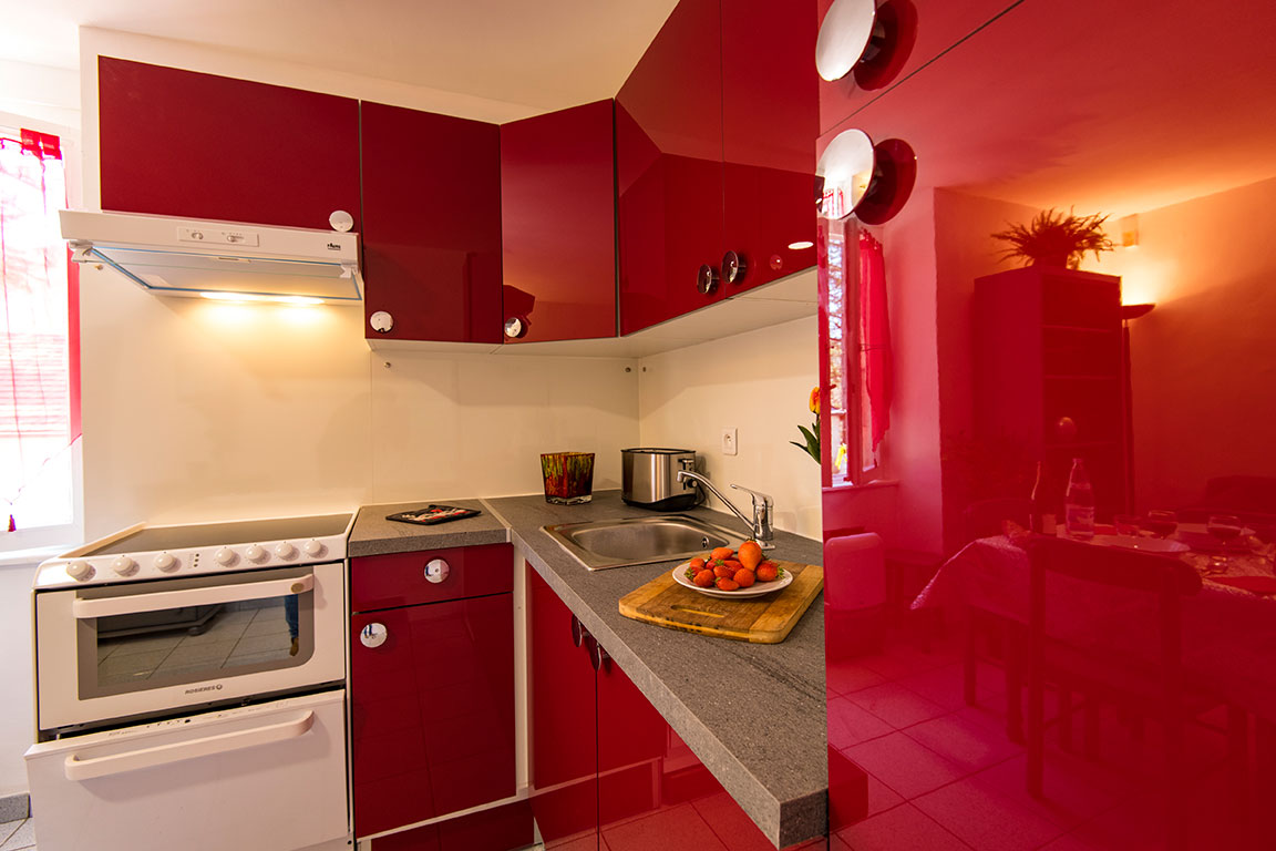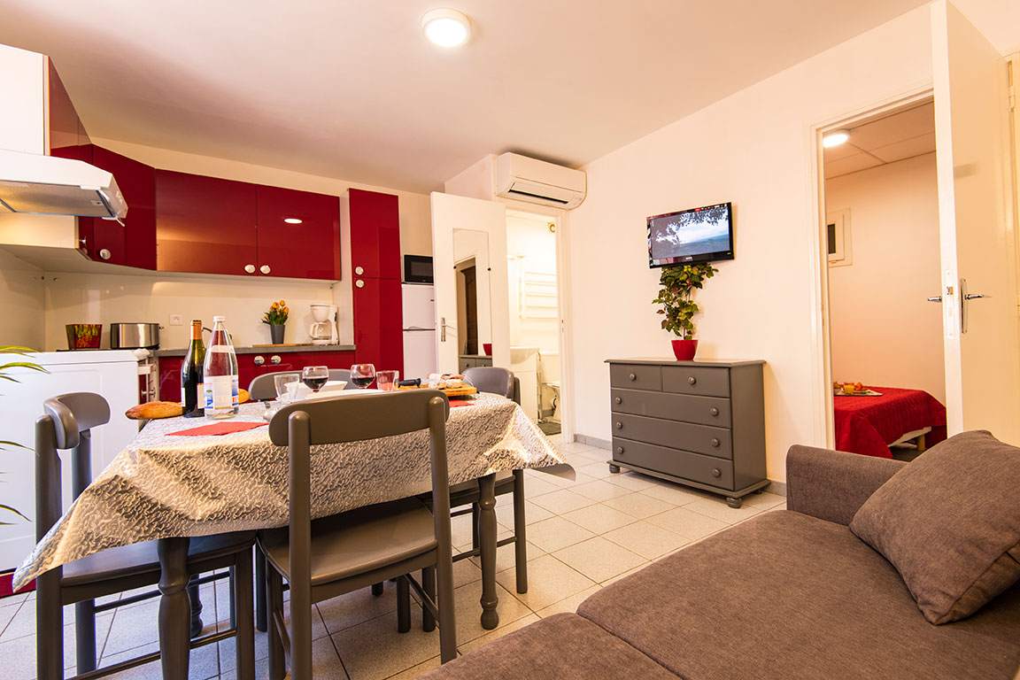 – une pièce à vivre avec coin salon canapé convertible Rapido TV écran plat, coin cuisine équipé avec plaque vitro, four, micro-onde, lave vaisselle, congélateur.